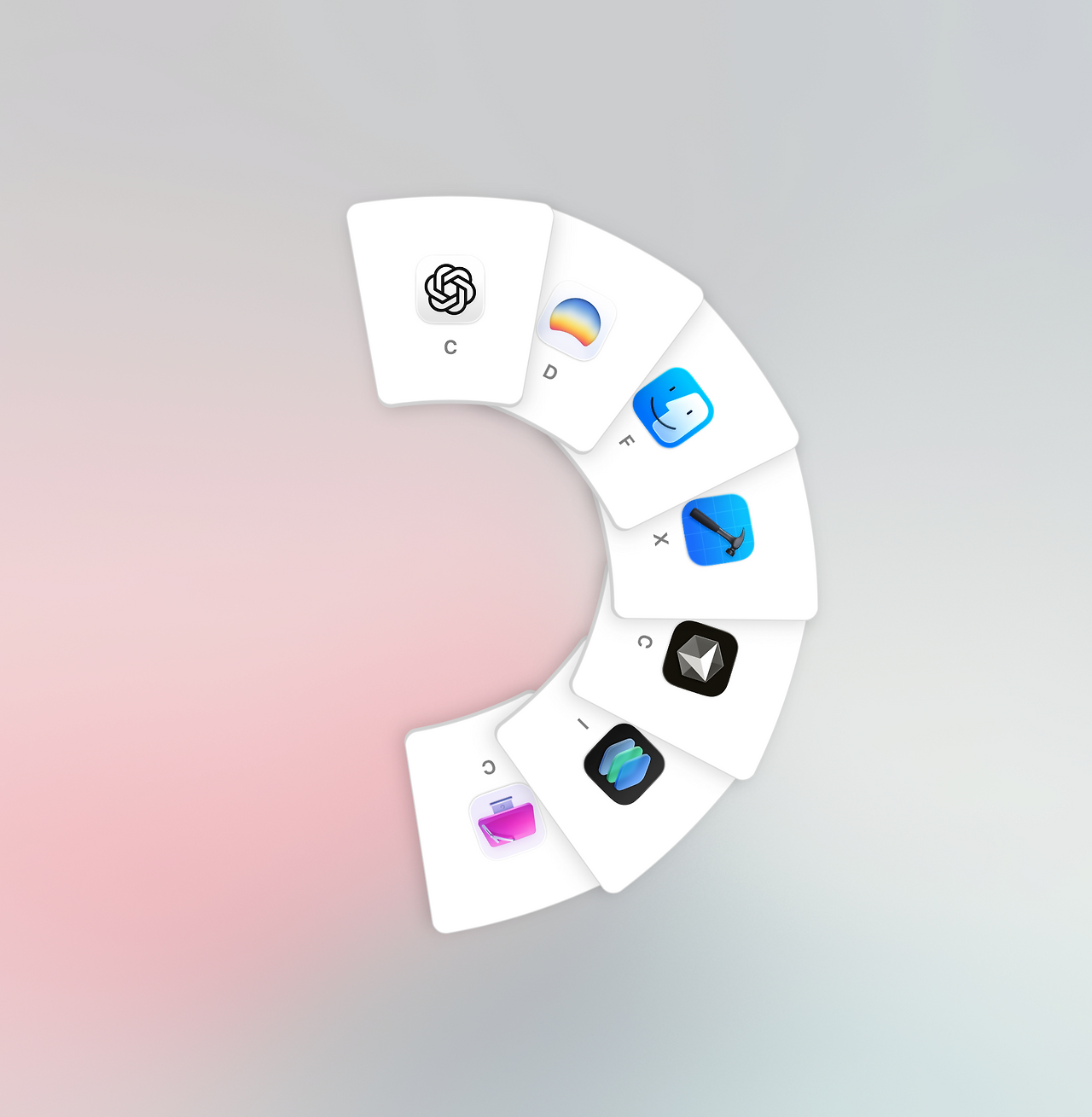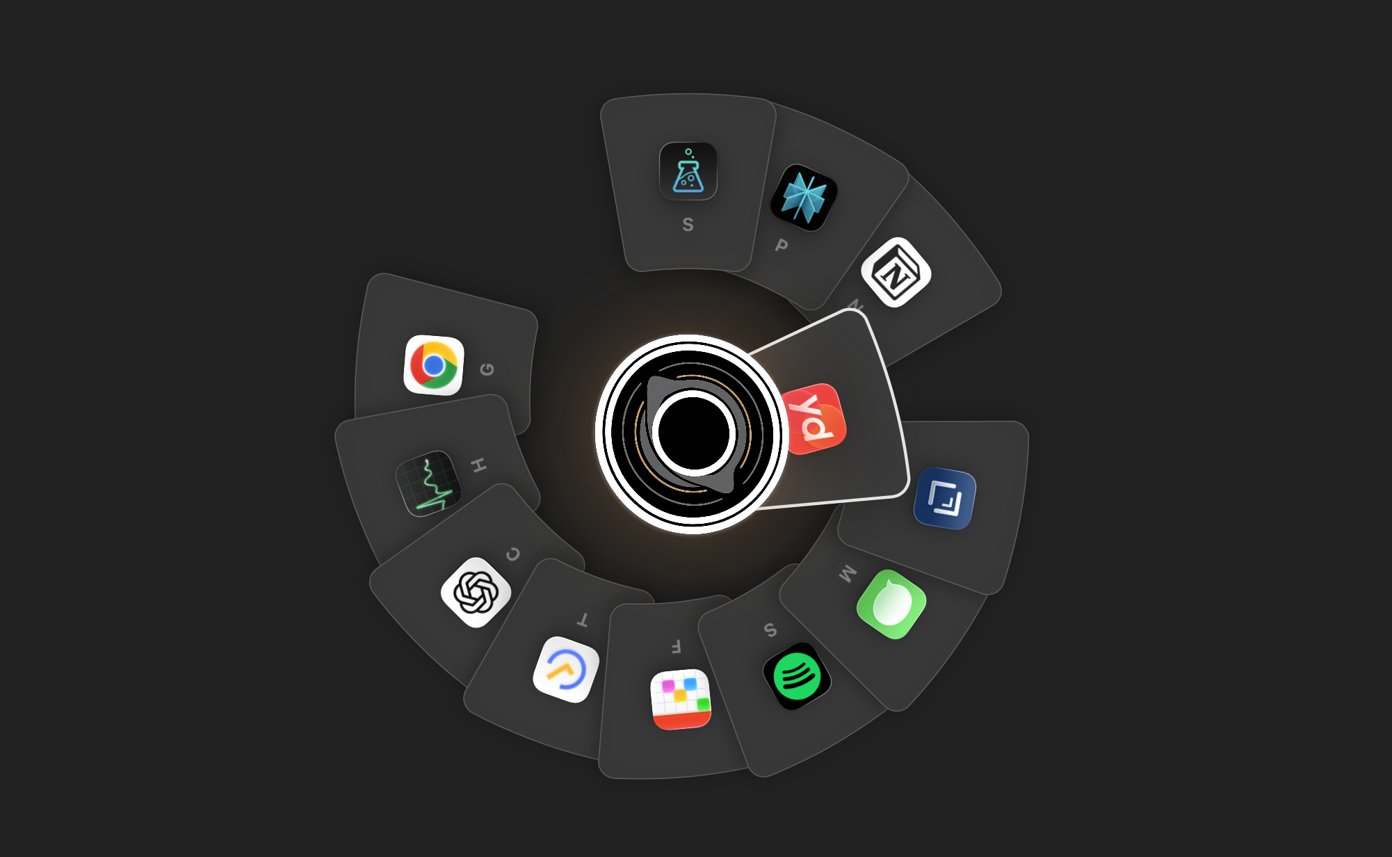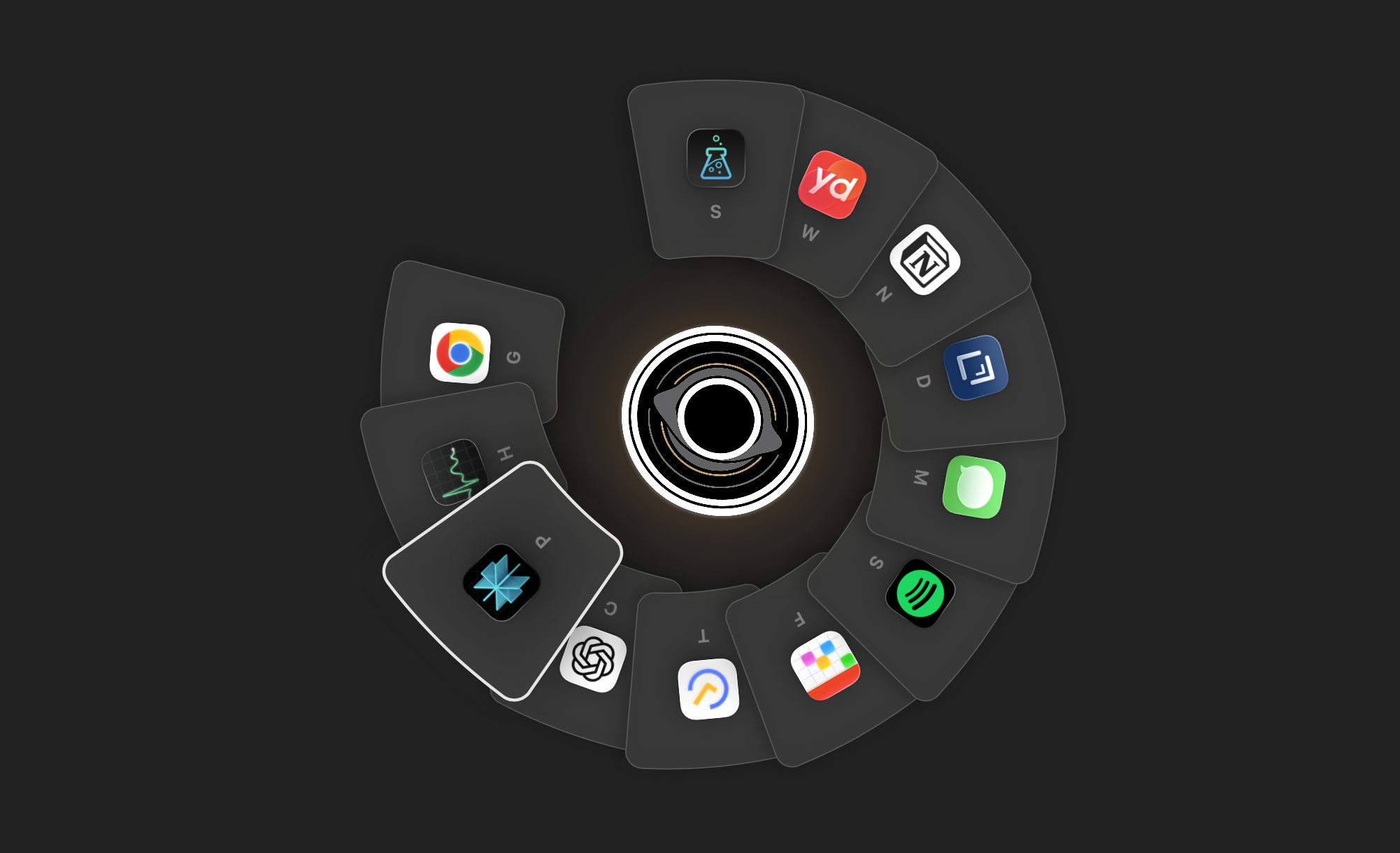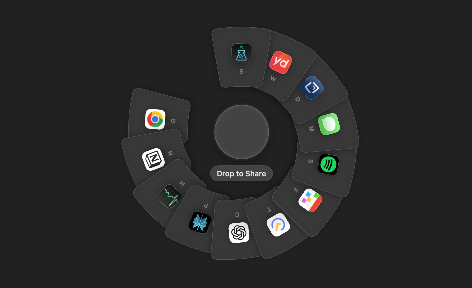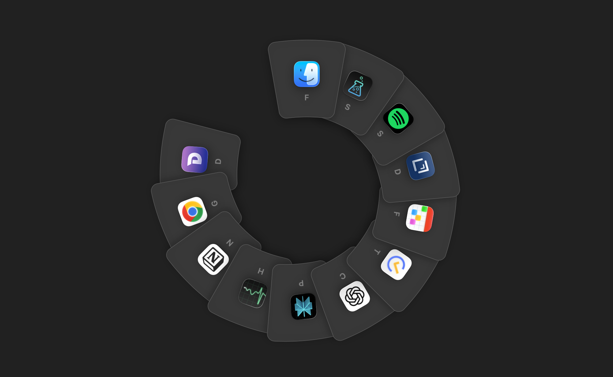 보조키(기본값 Option)를 길게 누르면 마우스 커서 주변에 현재 실행 중인 앱들이 라디얼(원형) 형태로 펼쳐지고, 탭이나 방향키로 원하는 앱을 선택하여 전환할 수 있다. 단순 앱 전환뿐 아니라 앱 종료, 파일 삭제, AirDrop 전송 같은 부가 기능도 제공한다.