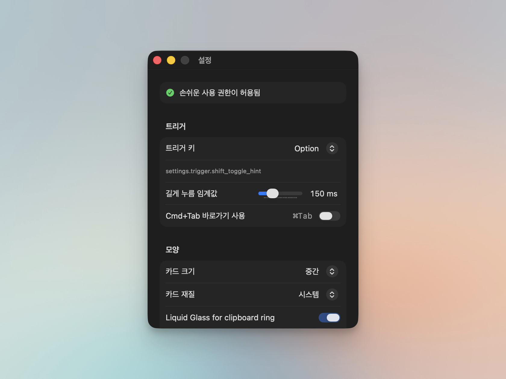 보조키는 Orbit 설정에서 [트리거 키] 옵션에서 변경할 수 있다. [Cmd + Tab 바로가기 사용]에 체크하면 Cmd + Tab을 눌렀을 때도 앱 전환기가 나타난다. 이 외에도 카드 크기와 재질(리퀴드 글래스 등), 전환기 표시 위치, 링 펼침 속도 등 취향에 맞게 세부 옵션을 조정할 수 있다.