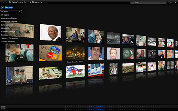 각종 이미지 검색 사이트의 검색결과를 3D로 멋지게 보여주는 확장기능입니다. 마우스 휠로 줌인/아웃도 되고 마우스 드래그를 좌우로 하면서 이미지들을 쫘악 볼 수가 있습니다. 각종 뉴스들이 이미지로 나오는데 (아마 이미지가 있는 뉴스겠죠?) 클릭하면 자세한 내용을 볼 수 있습니다. 그러나 영문뉴스들만 되는듯하네요, 아직 지원되는 사이트는 많지 않지만 아주재미있는 부가기능입니다. 그 밖에 구글 이미지 검색, 피카사, 플리커, 야후! 이미지 검색, 페이스북, 포토버킷, 디비언트 아트 등 각종 이미지 검색 사이트 또는 이미지 DB 사이트에서 이 확장기능을 이용할 수 있습니다.