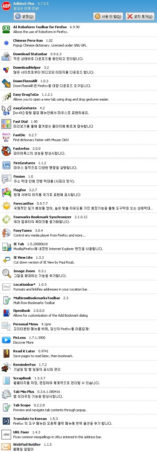 파이어폭스 3을 접한 지도 벌써 한 달이 지나갔네요.. 처음엔 반신반의로 사용했는데 다양한 확장기능과 편리함 때문에 IE7은 거들떠보기도 싫네요.. ㅎㅎ파이어폭스 3 (이하 파폭 3) 유용한 확장기능이 많고 아직 다 써보진 못했지만, 제가 쓰고 있는 확장기능에 대해서 포스팅해 볼까 해요.