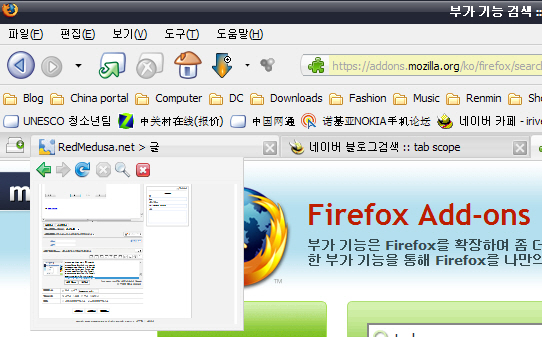 Tab Scope는 탭 위에 마우스를 대면 미리 보기를 지원해 주는 확장기능입니다. 그 외에 미리보기창 상태에서 뒤로, 앞으로, 새로고침 등이 가능하여 더욱더 유용한 부가기능이죠.