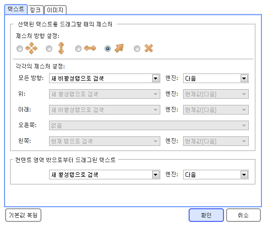 링크를 드래그해서 새 탭으로 열거나, 텍스트를 끌어서 검색하기, 이미지를 끌어서 새탭 열기나 다운로드하기 등을 지원합니다.