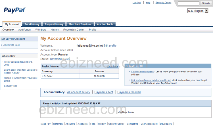 ๋๋ค. ์ฐ์ธก์ ๋ณด์๋ฉด To do list (ํด์ผ๋ ์ผ (2))๋ผ๊ณ ํ์ ๋์ด ์์ต๋๋ค. Confirm e-mail address - ์ด๋ฉ์ผ๋ก ์ธ์ฆํ๊ธฐ. Link and confirm my debit or credit card - ์ํ ์ฒดํฌ๊ฐ๋๋ ์ ์ฉ์นด๋๋ฅผ ํ์ดํ๊ณผ ์ฐ๋์ํค๊ธฐ. ๊ทธ๋ผ ๋จผ์ ์ด๋ฉ์ผ ์ธ์ฆ์ ํฉ๋๋ค.