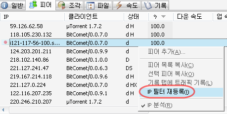 아래쪽 피어 부분에 리쳐가 붙은 아이피 목록이 나오는데요, 오른쪽 클릭 -> IP필터 재등록 버튼을 눌러주시면 자동으로 부정 패킷을 보내오는 대역을 밴 시킵니다. ▼