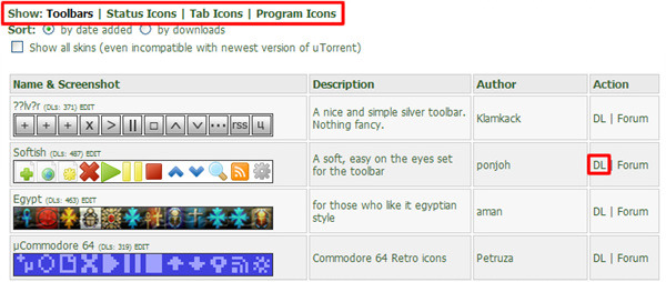 Show 부분에 Toolbar / Status Icons / Tab Icons / Program Icon로 각각의 스킨이 분류되어 있습니다. 원하는 스킨을 선택하셨으면 오른쪽의 DL을 클릭합니다.