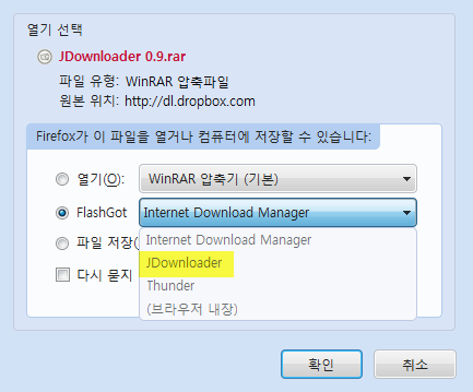 FlashGot 항목에 JDownloader가 추가된 모습. ▼