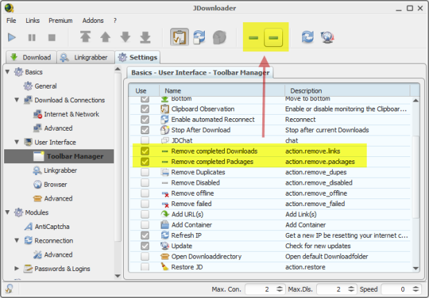 User Interface에 Toolbar Manager는 위 그림의 화살표, 즉 툴바 부분을 사용자가 원하는 메뉴를 추가 및 제거할 수 있는 항목입니다. 저 같은 경우엔 Remove Complete Downloads, Packages를 추가해 다운로드 완료된 파일을 클릭 한 번으로 목록에서 제거할 수 있게 지정했습니다. 각각 사용자 분들의 취향에 맞춰서 알맞게 지정해 보세요. ▼