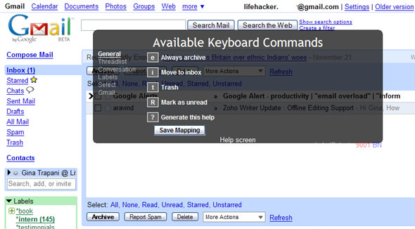 ? for help — Gmail에서 ? 키를 누르면 도움말 항목이 표시됩니다.