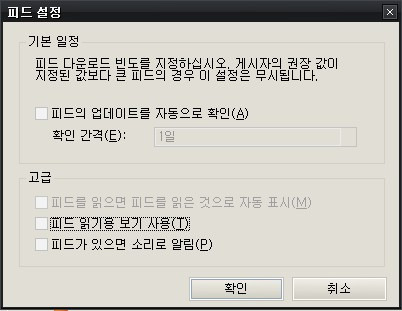 IE7의 RSS 리더 기능을 사용하지 않는다면 RSS 피드 관련 기능을 꺼서 IE의 부담을 조금 줄여줄 수 있습니다. 도구 – 인터넷 옵션 – 내용 – 피드 – 설정에 들어가 모든 체크 표시를 해제하면 됩니다.