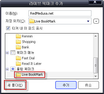 그럼 라이브북마크 추가메뉴가 나옵니다. 라이브북마크 전용 폴더를 별도로 생성합니다.
