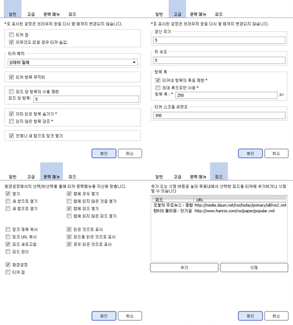 - 일반 탭 : Ticker의 위치(북마크 표시줄 밑, 상태바 밑)등을 설정할 수 있습니다.