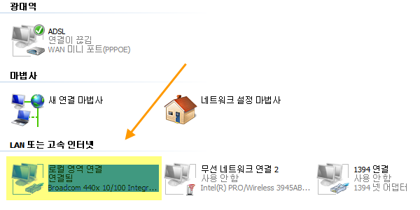 제어판 > 네트워크 연결 > 내 네트워크환경으로 이동합니다. 여기서 현재 사용하고 있는 랜카드 선택 > 마우스 우클릭 > 속성을 클릭합니다.