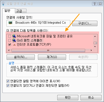 MS 네트워크용 클라이언트, 파일 및 프린터 공유, QoS 패킷 스케줄러 세 가지 옵션을 체크해제합니다.