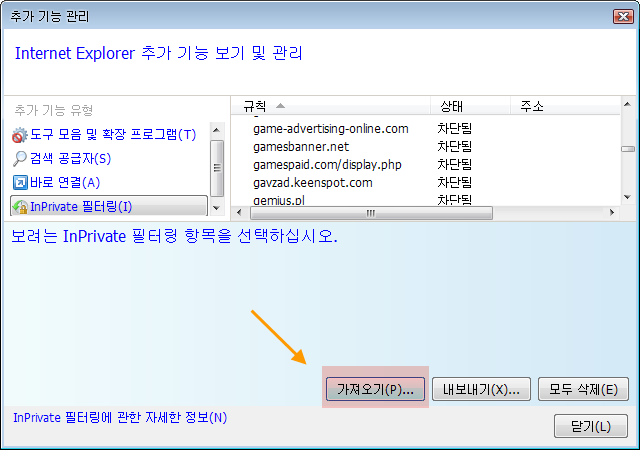 그 후 여기에서 Adblock XML파일을 다운로드합니다. 압축을 푸신 후 위 그림에 "가져오기(P)" 버튼을 눌러 아까 다운로드한 XML파일을 불러오면 됩니다.