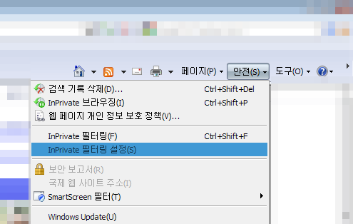 우측 상단에 안전 > InPrivate 필터링 설정을 클릭하여 줍니다.