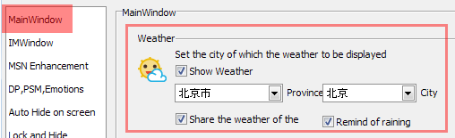 Main Window 항목에 Show Weather에 체크, 원하는 도시를 선택하시면 됩니다. 아까 눌렀던 풍선 부분위쪽에 구름 모양을 클릭하시면 좌측 상단에 날씨가 나타납니다.