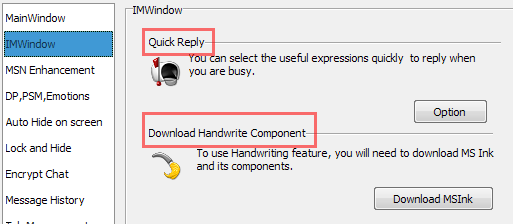 MWindow 항목을 보시면 Quick Reply, Handwrite Component 기능이 있는 걸 보실 수 있습니다. Quick Reply를 설정하면 자주 쓰는 문장 등을 미리 저장하여 사용할 수 있습니다. Handwrite Component는 네이트온의 잉크 기능과 흡사한 기능입니다, 즉 마우스로 직접 글쓰기가 가능하며, Download MSink 링크를 클릭하여 따로 다운로드해야 합니다.