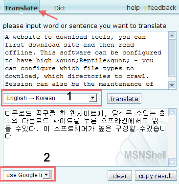 왼편은 사전 기능이며, 오른편은 번역 기능입니다. 사전, 번역 기능 둘 다 한국어로 바로 번역되는 건 영어 밖에 없네요. 그 외의 언어는 영어로 번역 뒤에, 그 번역 결과물을 한국어로 번역해야 됩니다. 오른쪽 이미지에서 1번은 언어를 선택하는 부분이고, 2번은 구글, 야후 번역 등을 선택하는 부분입니다.
