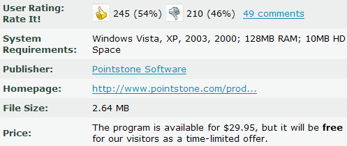 다운로드 페이지를 클릭하면 간단한 프로그램 정보와, 아래쪽에 아래 그림처럼 해당 프로그램에 대한 사용자 평가와, 시스템 요구사항, 제작사, 홈페이지, 파일크기, 소프트웨어의 원래 가격 등의 정보가 나옵니다. 2009년 8월 6일 현재 사용자의 모든 사용 기록을 제거해 주는 Total Privacy 5 프로그램을 제공하고 있습니다. 필요하신 분들.. 서두르세요! ㅋㅋ