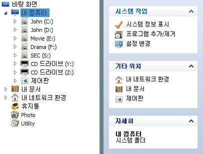 - Open folder in: Explore current folder에서 사용할 프로그램 지정. 기본 설정은 탐색기 왼쪽 부분이 위 이미지의 오른쪽처럼 시스템 작업, 기타 위치...... 이런 식으로 나오지만, Open Folder in Custom : Explorer /e, 로 설정하여 주면 위 그림의 왼쪽 부분처럼 드라이브의 목록들이 나옵니다. 그 외에 토털 커맨더나, 기타 탐색기 관련 프로그램을 따로 지정할 수 있습니다.