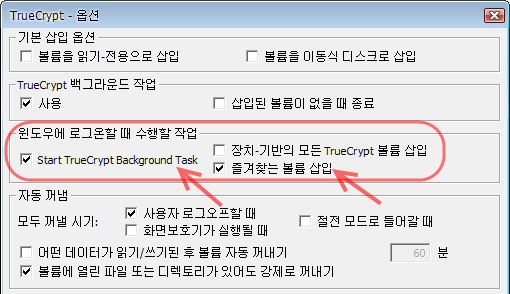 역시 메뉴 부분에서 Settings -> 설정으로 가신 뒤 Start TrueCrypt Background Task 부분과 즐겨 찾는 볼륨 삽입 부분에 체크하여 주시면 되겠습니다.