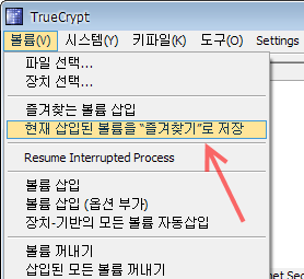 그래서 사용자가 자주 실행하는 가상 볼륨을 즐겨찾기에 추가 한 뒤, 부팅 시 자동으로 삽입해 주는 옵션에 체크하여 주면, 재부팅 시 비밀번호만 입력함으로써 자동으로 그 볼륨을 삽입하여 줍니다.