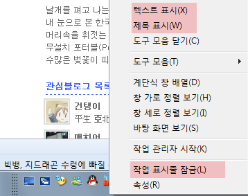 마우스 오른쪽 클릭 → 작업 표시줄 잠금, 텍스트 표시, 제목표시 모두 체크해제 한 다음 원하는 위치로 옮겨줍니다. 그 후 다시 작업 표시줄 잠금에 체크하면 XP와 비슷한 형식의 퀵런치가 완성됩니다.