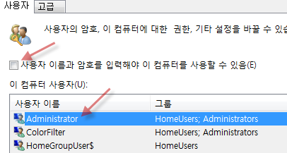 그 후 관리자 계정만 사용하려면 시작 → 검색창에 netplwiz 입력/실행 → Administrator 선택 → "사용자 이름과 암호를 입력해야 이 컴퓨터를 사용할 수 있음"에 체크해제 하시면 됩니다. 비밀번호를 입력하지 않고 자동으로 로그인 해주는 옵션으로 아래 이미지의 두번째 화살표 부분에서 사용자를 선택해주면 됩니다.