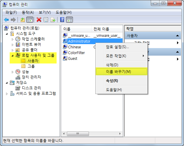 관리자 계정으로 설치하면 사용자 이름이 무조건 Administrator으로 나오게 되는데요, 사용자 이름이 마음에 안드시면 내 컴퓨터 오른쪽 클릭 → 관리 → 로컬 사용자 및 그룹 → 사용자에서 Administrator의 이름을 원하는 이름으로 변경해 주시면 되겠습니다.