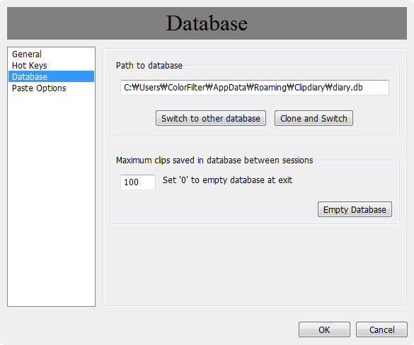 옵션 부분은 총 4가지로 나누어지는데, 메뉴가 모두 간단하여서 굳이 별다른 설명이 필요 없을 듯합니다. 왼쪽에 Database 탭에 Maximun Clips saved in database between sessions 항목에서 클립 보드가 저장될 최대 개수를 설정할 수 있으며, Empty Databse를 클릭하면 여태 저장된 클립보드의 내용들이 모두 삭제됩니다.