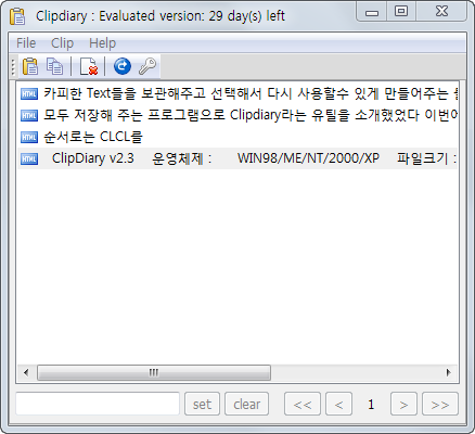 컴퓨터를 이용하다 보면 CTRL+C를 통하여 복사하기와 CTRL+V를 이용한 붙여 넣기 작업이 수십 번 혹은 수백전 이루어지기도 합니다. 우리가 접하는 정보가 많은 만큼 저장해야 될 자료는 늘어납니다. 하지만 윈도우 클립보드에 저장되는 개수는 오직 하나입니다. 따라서 메모장에 복사한 것을 붙여 넣기 하여 다음 문장을 복사하거나 하는 대체 방법을 쓰거나, 기타 메모 클립 애플리케이션을 쓰기도 하는데요, Clipdiary는 사용자가 지정한 개수만큼 클립보드를 저장할 수 있으며, 간단한 조작으로 클립보드 관리가 가능합니다. 프로그램을 써보면 오피스의 클립보드 관리기능과 상당히 흡사하단걸 느낄 수 있었는데요, 여하튼 매우 유용한 녀석입니다.