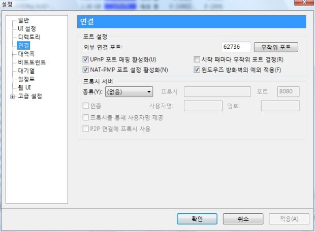 □ 외부 연결 포트(Port used for incoming connections) : 프로그램이 사용하는 포트를 설정합니다. 당연한 내용이지만 방화벽과 NAT(공유기)를 사용할 경우 Port Forwarding을 이용해서 통신환경을 만들어줘야 합니다.