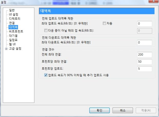 □ 다운 중이 아닐 때의 업 속도(Alternate upload rate when not downloading) : 배포만 할 때의 전역 최대 업로드 속도에 대한 제한을 별도로 설정합니다. 보통 시스템 성능 문제로 업로드와 다운로드를 같이 할 때 문제가 발생할 경우 사용합니다.