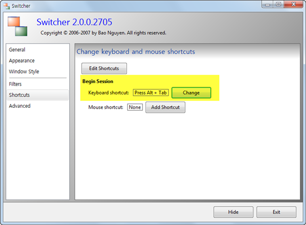 Shortcuts 옵션에서 단축키를 지정해 주실 수 있습니다. 기본은 Win `(Tab키 위에 있는 키)으로 되어 있는데 전 윈도우 기본 화면 전환을 대체하기 위해서 Alt Tab으로 하였습니다. 별 충돌 없이 정상적으로 잘 실행되네요.. 또한 Switcher 활성화 화면에서 마우스, 숫자 1~9키 혹은 Tab키(활성화 단축키를 Alt Tab으로 지정했을 경우)를 이용하여 프로그램을 선택할 수 있습니다. ▼