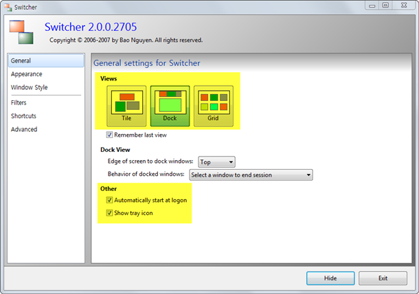 저 같은 경우엔 무설치 버전으로 실행했습니다. 화면 분할의 종류는 Tile, Dock, Grid의 형태가 있으며 각자 사용자가 원하는 것을 선택하여 사용하시면 됩니다. 옵션 항목에서는 투명도, 애니메이션, 스타일 등을 변경할 수 있습니다. ▼