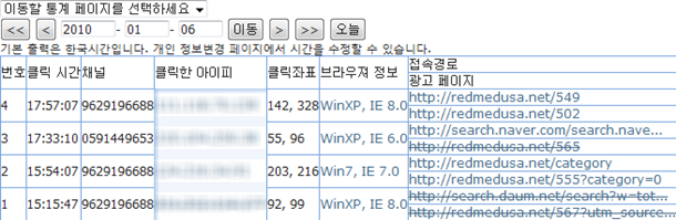 ❺ 또한 마이센스에서 자체적인 클릭이 발생한 시간, 아이피, 좌표 등으로 나누어진 간단한 통계도 내어줍니다. 특정 아이피가 클릭한 횟수나 시간별, 날짜별로 클릭이 발생한 횟수도 확인할 수 있습니다.