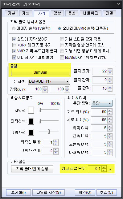 SimSun(중국어 자막을 보려는 분들에게 가장 적절한 폰트입니다. 물론 한글 영어 폰트 역시 잘 나옵니다. 중국어 자막과 관련이 없는 분들은 원하는 폰트를 설정하시거나 기본으로 하셔도 무난합니다) - 싱크 조절 단위: 0.1초 (동영상 재생 시