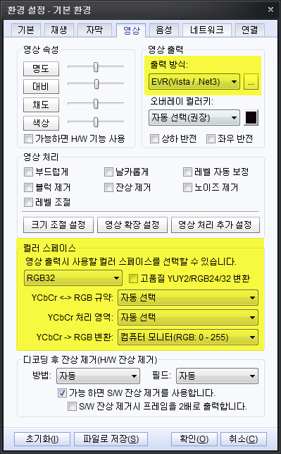 - 영상 출력 - 출력 방식: XP 사용자는 VMR 9(DirectX 9) 혹은 VMR 9 Renderless, 비스타/윈도우7 사용자는 EVR(Vista, .Net3) 혹은 EVR Renderless를 추천(설정 시 자막이 영상 안쪽으로 출력됨)
