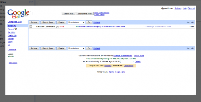 부가기능을 설치하면 우측 하단 작업메뉴에 빨간색으로 된 편지 봉투 모양의 지메일 아이콘이 생깁니다. 메일을 확인하고 싶을 때 살포시 클릭해 주면 팝업창이 뜨면서 지메일 첫 화면이 뜨게 됩니다. 아래는 2010.02.12일까지 사용하면서 발견된 약간의 에러 사항입니다.