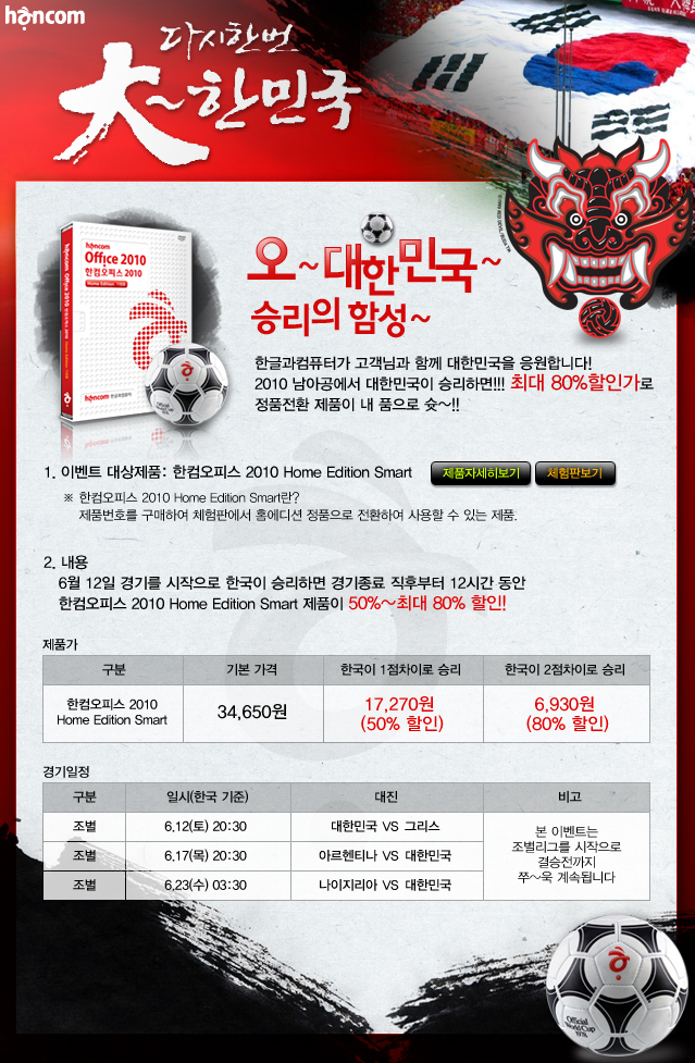 남아공 월드컵을 맞아 한글과컴퓨터에서 이벤트를 진행하고 있습니다. 국산 오피스 소프트웨어의 자존심인 한컴오피스 2010을 최대 80% 할인된 6,930원에 구매할 수 있다고 하네요. 오는 6월 17일 아르헨티나전과 6월 23일 나이지리아전에서 한국이 각각 1점 차, 2점 차로 승리하면 할인 가격인 17,270원, 6,930원에 구매할 수 있다고 합니다. 관심 있으신 분은 서둘러 보세요.^^