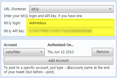 부가기능을 설치한 뒤 설정에서 자신의 트위터 계정을 등록합니다. 주소를 자동으로 짧게 변환하고 싶다면 bit.ly 같은 서비스의 로그인 아이디와 API Key를 입력하면 됩니다. bit.ly의 경우 account 페이지에서 API Key를 확인할 수 있습니다.