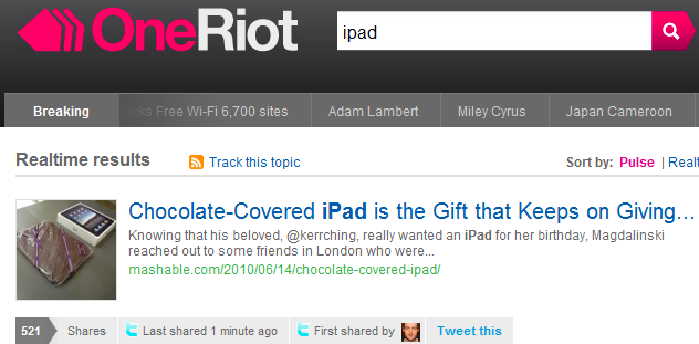 아래 설명 중, 주소표시줄에 OneRiot라는 버튼이 있었는데요, 미국의 웹 검색 서비스를 제공하는 사이트입니다. 주소창에 원하는 검색어를 입력하고 빨간색의 Oneriot버튼을 클릭하면 이 사이트를 통한 결과를 보실 수 있습니다. 도출되는 결과는 사용자 임의로 인기, 실시간으로 정할 수 있습니다.