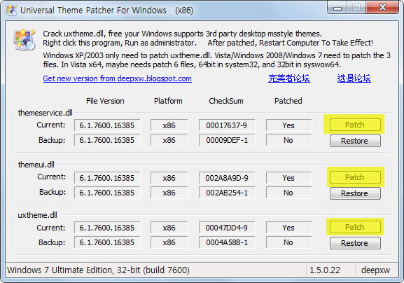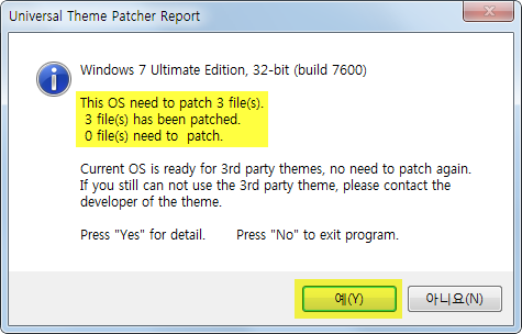 themeservice.dll, themeui.dll, uxtheme.dll 세 항목에서 모두 오른쪽의 patch 버튼을 눌러주세요. 작업이 끝나면 재부팅하면 됩니다. Restore 버튼을 누르면 패치 전 상태로 복구할 수 있습니다.