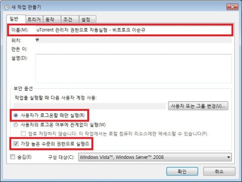 3. 새 작업 만들기 창이 뜨면 이름에 원하는 작업 이름을 임의로 적어줍니다. 보안 옵션 란의 사용자가 로그온 할 때만 실행(R)이 선택된 것을 확인하고 이 방법의 핵심!!! 가장 높은 수준의 권한으로 실행(I)에 체크해 줍니다. 여기에 꼭 체크해 주셔야 UAC 창을 거치지 않고 관리자 권한으로 실행됩니다.