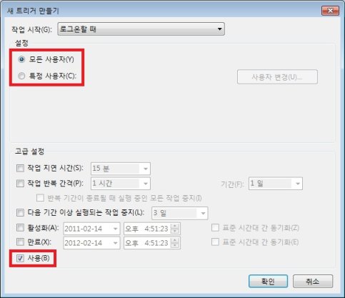 6. 설정란에서 모든 사용자(Y) 또는 특정 사용자(C) 중 원하는 것을 선택하고 고급 설정의 사용(B)에 체크된 것을 확인한 뒤 확인 버튼을 클릭합니다.