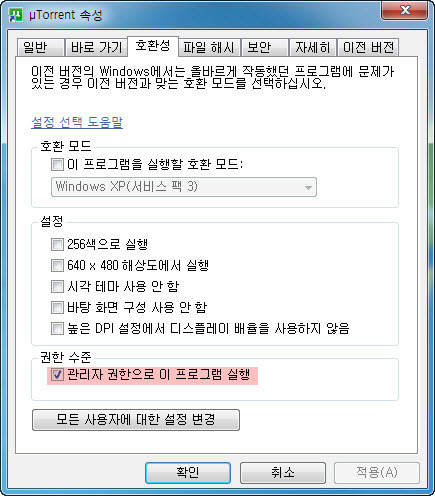 uTorrent 관리자 권한으로 실행