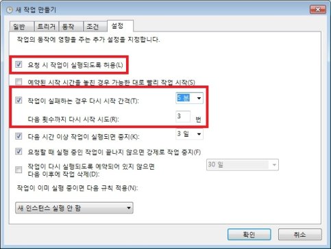 9. 마지막으로 설정 탭으로 이동한 후 요청 시 작업이 실행되도록 허용(L)에 체크된 것을 확인하고 작업이 실패하는 경우 다시 시작 간격(T)을 적당히 설정해 줍니다.