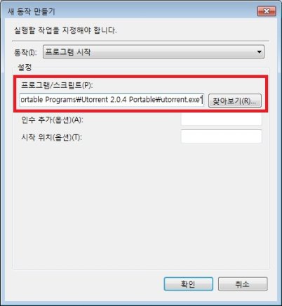 8. 프로그램/스크립트(P)란에 uTorrent의 경로를 입력하거나 찾아보기(R)을 이용하여 경로를 지정합니다.