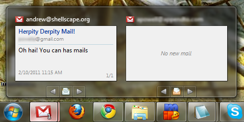저는 지메일(Gmail)을 사용하는데, 매번 메일을 확인하러 지메일 사이트로 들어가기 귀찮죠, 그래서 파이어폭스의 Gmail Notifier 부가기능을 사용했었는데, 이 부가기능이 윈도우 7용 프로그램 형식으로도 제공하네요. 작업표시줄에 고정해 놓고 마우스를 대면 섬네일 형식으로 이메일을 확인할 수 있고, 도착한 메일수에 상관없이 이전/다음 버튼으로 제목과 내용을 간략하게 살펴볼 수 있습니다.