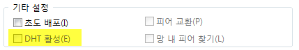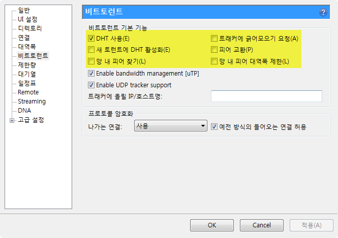 이미지의 노란색 하이라이트 부분 DHT 사용을 제외하고 모두 체크 해제합니다. 이렇게 하면 새 토렌트에 DHT 활성화가 체크되지 않기 때문에 DHT를 사용할 수 있는 파일을 추가해도 기본적으로 사용 불가 상태로 설정됩니다.